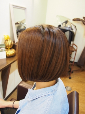 やや前下がりのワンレングスボブ。