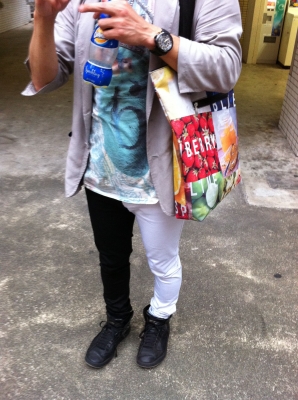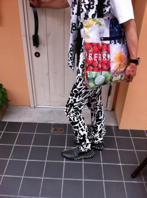 パンツが派手なので 上はシンプルに白Tシャツにしたそうなんですが・・・
