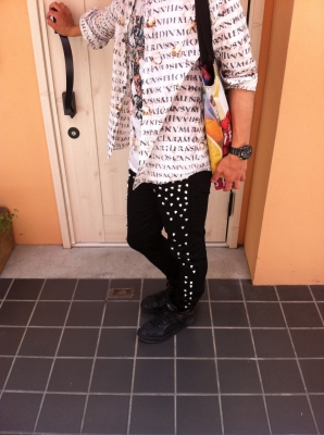 パンツは 流れ星のような配置のスタッズがおしゃれな 黒パンツです