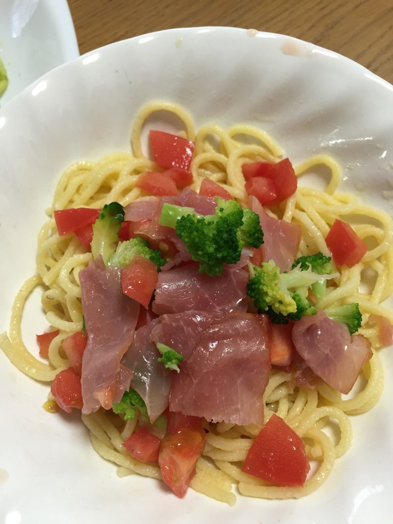 生ハム、ブロッコリー、トマトをのせて 鰹節で出汁をとってオリーブオイル、白ワインビネガー、醤油、塩コショウを混ぜたソースをかけてカッペリーニ風のパスタも作ってみました![]()