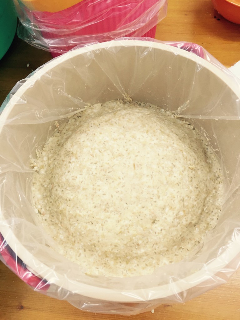 麹と塩が良く混ざったら 大豆と混ぜて少し大豆のゆで汁も混ぜます![]()