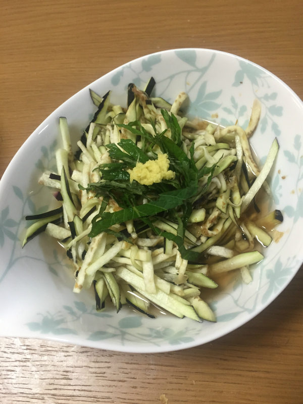 新鮮だったので 茄子は千切りにして水にさらして 紫蘇と生姜をのせて