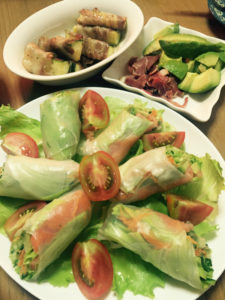 きゅうりは レタス にんじん サーモン アボカドと生春巻きにしてみました![]()