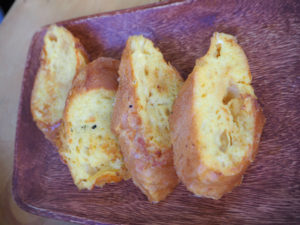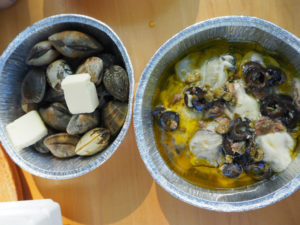 バケットの半分を 牡蠣のアヒージョの付け合わせにして