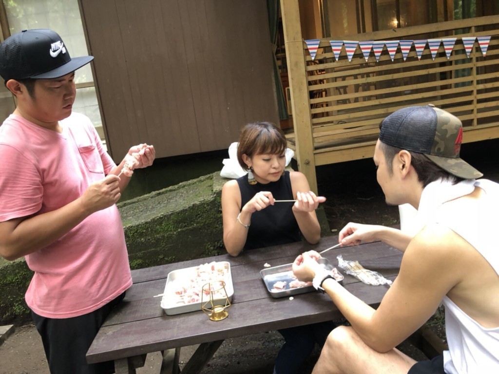 お肉屋さんで焼き鳥用にカットしてもらった鶏肉を串に刺して