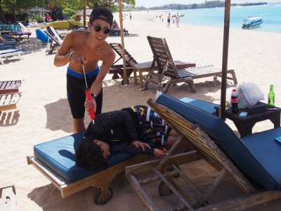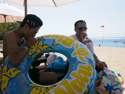 日本から持ってきた浮き輪を膨らませてる 井出ちゃんとワヤン