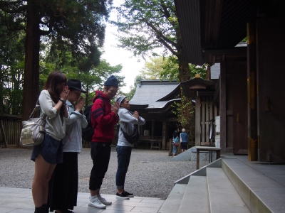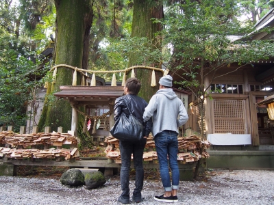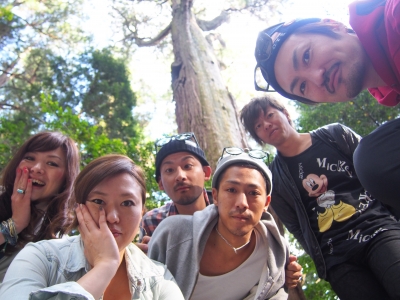 夫婦杉の前で祈願する 比嘉さんと井出ちゃん