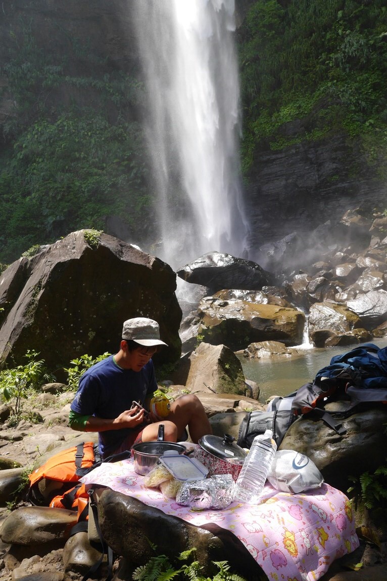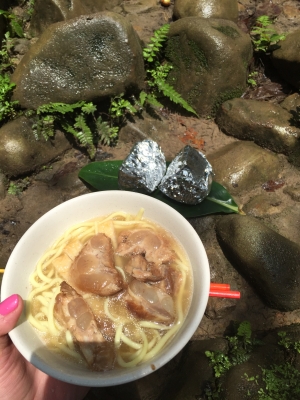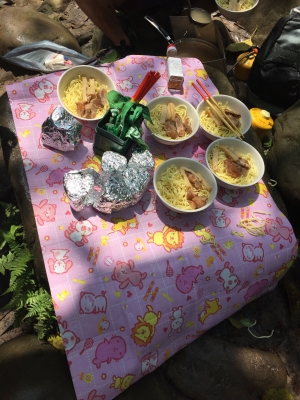 なんと滝の麓でお湯沸かして 八重山そば作ってます
