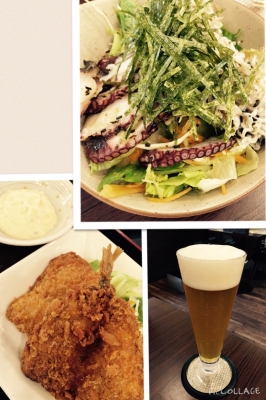 生シラスと生タコのサラダ アジのフライとビール(笑)