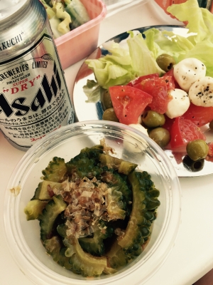 お友達は モッツアレラチーズとトマトのサラダと ゴーヤを持ってきてくれました