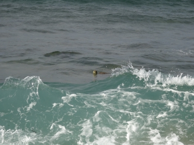 波打ち際に行ってみると カメが 顔を出して息継ぎしてました