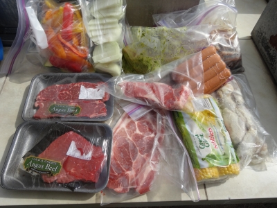 食べ物は ステーキ スペアリブ ポーク ソーセージ 野菜など盛りだくさん